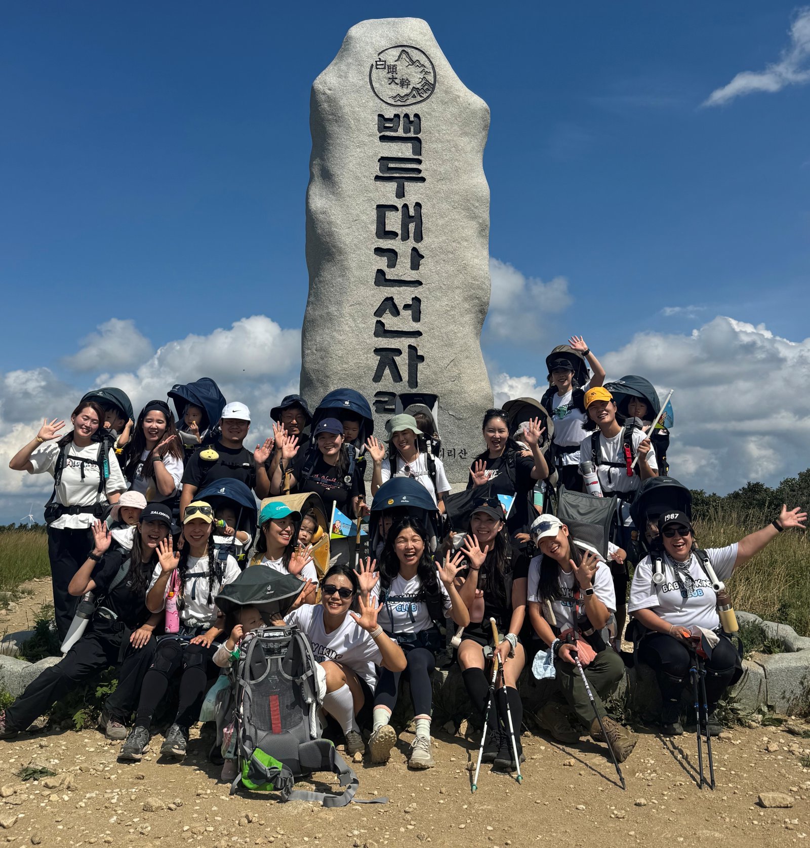베이비하이킹클럽 회원들이 아이들과 함께 대관령 북쪽 백두대간 선자령에 올라 포즈를 취했다. 오언주 회장 제공.김 씨도 거들었다.