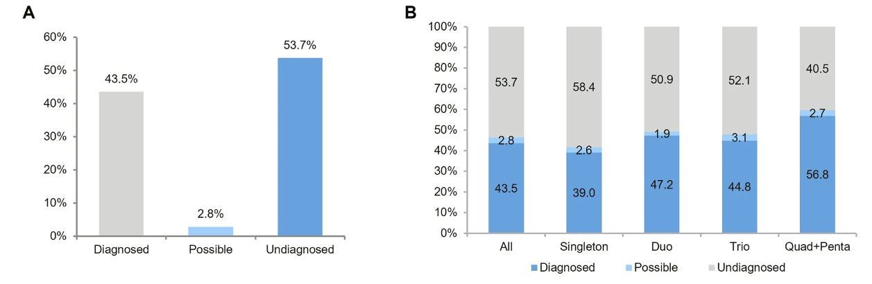 연구팀은 환자의 주요 증상을 기준으로 질환 유형을 분류한 뒤, 말초혈액을 이용해 전장 유전체 분석을 시행했다. 분석 결과는 증상과 유전자 변이의 연관성에 따라 ▲진단 ▲진단 가능 ▲미진단으로 구분했으며, 가구당 대표 환자 1명을 기준으로 진단 여부를 평가했다.