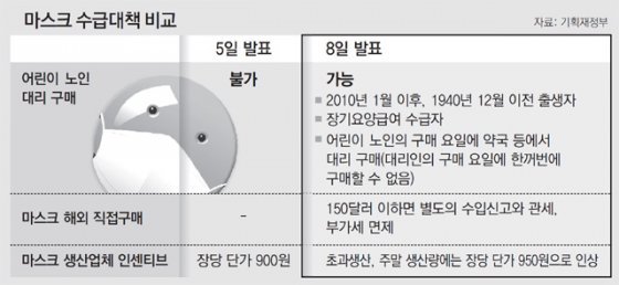 김용범 기획재정부 1차관은 브리핑에서 “현장에서 들었던 내용의 90%가 대리구매 제한이 너무 엄격하다는 것이었다”며 “최대한 공평한 배분에 초점을 맞춰 불가피한 사정의 대리구매는 허용하고 5부제 제한은 유지하기로 했다”고 말했다.