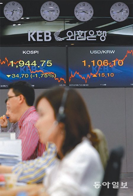 요동치는 코스피 엔-달러 환율이 달러당 100엔을 돌파한 10일 코스피와 원화가치는 요동쳤다. 코스피는 전날보다 34.70포인트 내린 1944.75, 원-달러 환율은 15.10원 상승(원화 가치는 하락)한 1106.10원으로 마감했다. 원대연 기자 yeon72@donga.com9일(현지 시간) 미국 뉴욕 외환시장에서 엔-달러 환율은 전날 종가보다 1.59엔(1.61%) 오른 달러당 100.61엔에 거래됐다. 엔-달러 환율이 100엔을 넘은 건 2009년 4월 14일 이후 4년 1개월 만에 처음이다. 또 10일 도쿄 외환시장에서 엔-달러 환율은 101.05엔까지 올랐다.