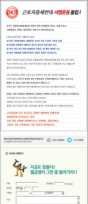 한국 납세자연맹은 “이번 연말정산 세법 개정은 신뢰성이 전혀 담보 되지 않은 정부의 세수추계를 진실로 믿고 법을 통과시킨 중대하고 명백한 잘못이므로 이를 무효화 하는 ‘근로자 증세반대 서명운동’을 21일부터 연맹 홈페이지에서 시작했다”고 21일 밝혔다.