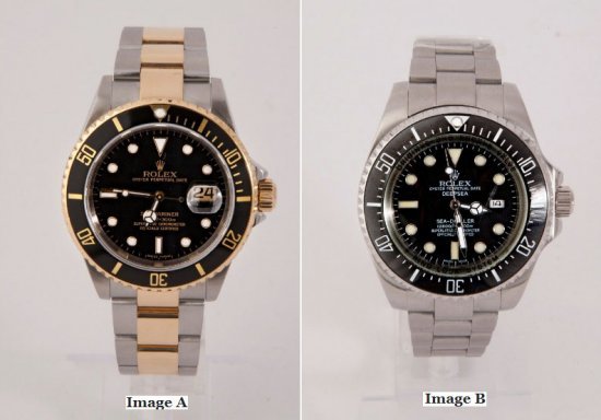 사진출처: 주얼리 시계 업체 윌리엄 메이(William May) 제공.사진은 롤렉스 시계이다. 위 두 장의 사진 중 하나는 진품이고 하나는 모조품이다. 어느 것이 진짜일까. 찬찬히 한참을 들여다봐도 시계를 잘 모르는 사람에게 진품을 찾는 일은 쉽지 않다. 진품은 왼쪽 사진, 이미지 A이다.