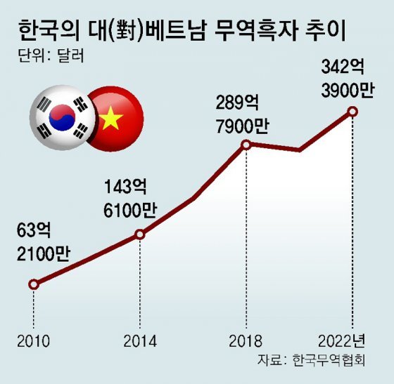 지난해 한국과 베트남 간 무역수지(흑자)는 342억3900만 달러로 베트남이 처음으로 한국 최대 무역수지 흑자국으로 떠올랐다. 재계 관계자는 “베트남은 내수 시장이 큰 중국에 비해 상대적으로 규모가 작아 이해관계가 충돌하더라도 신뢰가 깨지기보단 한국과의 협력 필요성이 훨씬 크다”고 말했다.