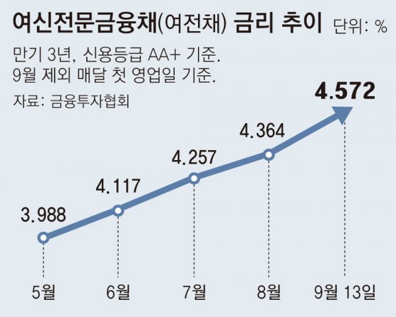 14일 금융투자협회에 따르면 13일 기준 신용등급 AA+인 3년 만기 여전채의 평균 발행금리는 연 4.572%였다. 지난달 초(4.364%)에 비해 0.208%포인트 상승한 것이다. 여전채란 카드, 캐피털 회사 등이 운영 자금을 확보하기 위해 발행하는 채권이다. 카드, 캐피털은 은행권과 달리 고객에게 예·적금을 받을 수 없어 필요 자금의 약 70%를 여전채로 마련한다.