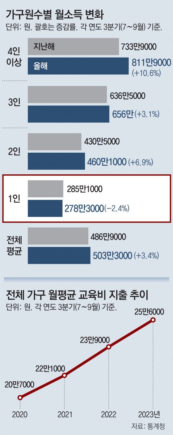 26일 통계청 가계동향조사에 따르면 올해 3분기(7∼9월) 양 씨와 같은 1인 가구의 소득은 가구원수별 가구 가운데 유일하게 줄었다. 1인 가구의 월평균 소득은 278만3000원으로 1년 전보다 2.4% 감소했다. 같은 기간 2인(6.9%), 3인(3.1%), 4인(10.6%) 가구 소득이 모두 늘고 전체 평균도 3.4% 늘어난 것과 대조된다. 20, 30대 미혼 직장인부터 사별한 홀몸노인까지 다양한 유형의 1인 가구는 2021년 기준 전체 가구의 33.4%를 차지한다.