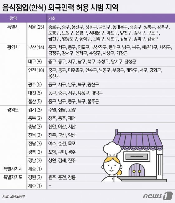 현행 법에 따라 식당에서는 내국인을 제외하고는 방문취업(H-2) 비자로 국내에 들어온 중국·구소련 동포나, 유학(D-2) 비자로 입국한 유학생만 식당 취업이 가능하다.