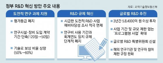 정부가 글로벌 연구개발(R&D)에 향후 3년간 5조4000억 원의 예산을 투입하기로 했다. 도전적 연구를 지원하기 위해 평가 방식을 바꾸고, 국가적으로 시급한 사업은 예비타당성조사를 면제하기로 했다.