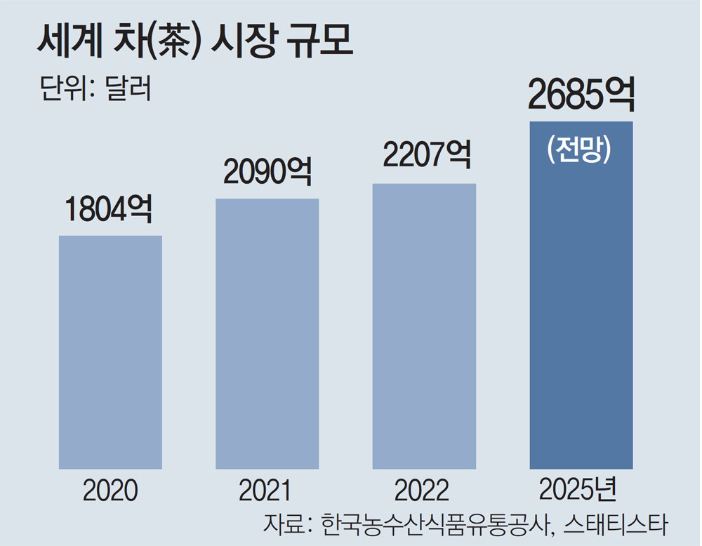 21일 한국농수산식품유통공사(aT)의 농식품수출정보(KATI)에 따르면 세계 차 시장 규모는 2022년 기준 2207억 달러(약 295조 원)로 2020년의 1804억 달러보다 22.3% 증가했다. 시장은 2025년 2685억 달러까지 성장할 것으로 전망된다. 5년 새 시장이 50% 가까이 성장할 것으로 예상되는 것이다.