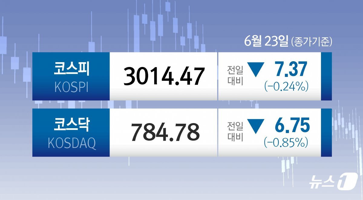 23일 한국거래소에 따르면 코스피는 전 거래일 대비 7.37p(-0.24%) 하락한 3014.47로 거래를 마쳤다.