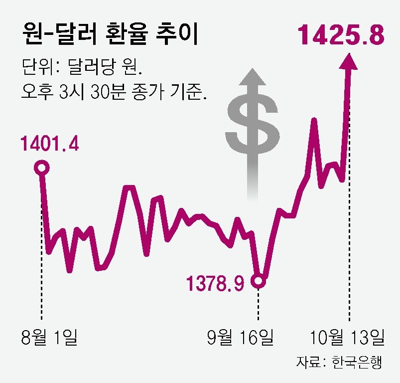 13일 서울 외환시장에서 원-달러 환율은 전 거래일 대비 4.8원 오른 1425.8원으로 주간 거래를 마쳤다. 주간 종가 기준으로는 4월 29일(1437.3원) 이후 가장 높은 수준이다.