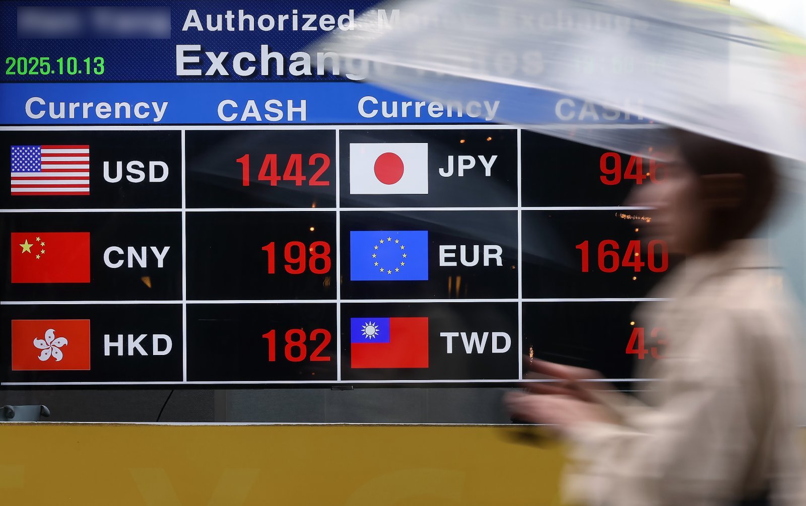 미중 무역 갈등 재점화에 따른 불확실성이 커지며 달러·원 환율이 장중 1430원대까지 상승하는 등 변동성 확대에 외환당국이 구두개입에 나선 13일 오후 서울 중구 명동의 환전소 앞에 환율이 표시되어 있다. 2025.10.13/뉴스1