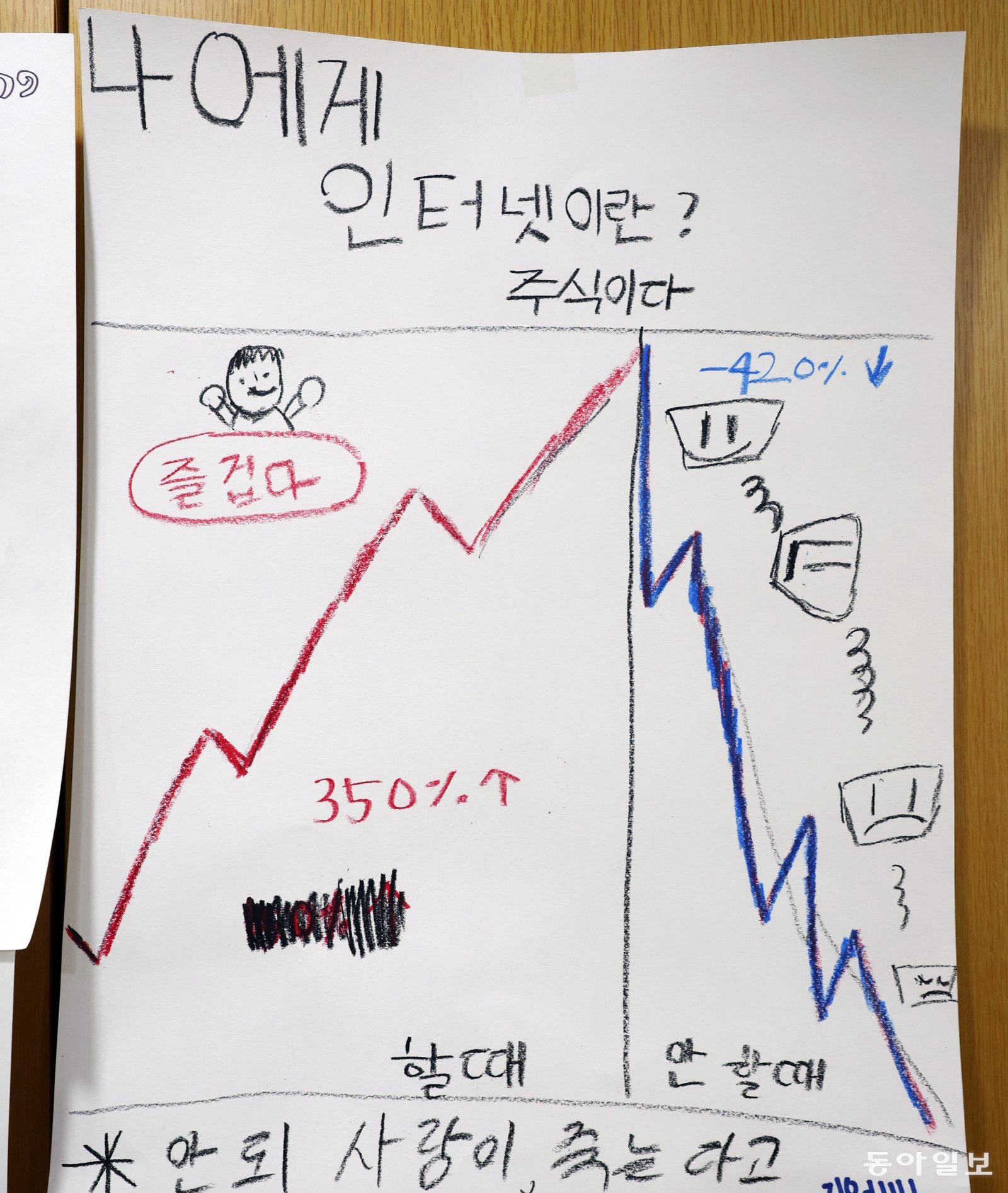 SNS 중독 치유 캠프에 참가한 한 중학생이 그린 그림. 인터넷과 스마트폰을 할 때는 주가가 오를 때처럼 즐겁고, 하지 않을 때는 주가가 폭락할 때처럼 괴롭다는 것을 표현했다. 신원건 기자 laputa@donga.com그러나 정작 SNS를 통해 청소년이 얻는 심리적 만족은 크지 않았다. 응답자의 20.7%는 SNS 사용 시간 조절을 하지 못해 스스로를 자책한다고 했고, 11.7%는 공허함을 느낀다고 답했다. 홍다운 부산 충렬중 교사는 “현실의 초라한 내 모습과 SNS에서 부풀린 내 모습이 너무 달라 우울감을 호소하는 학생들도 있다”고 말했다.