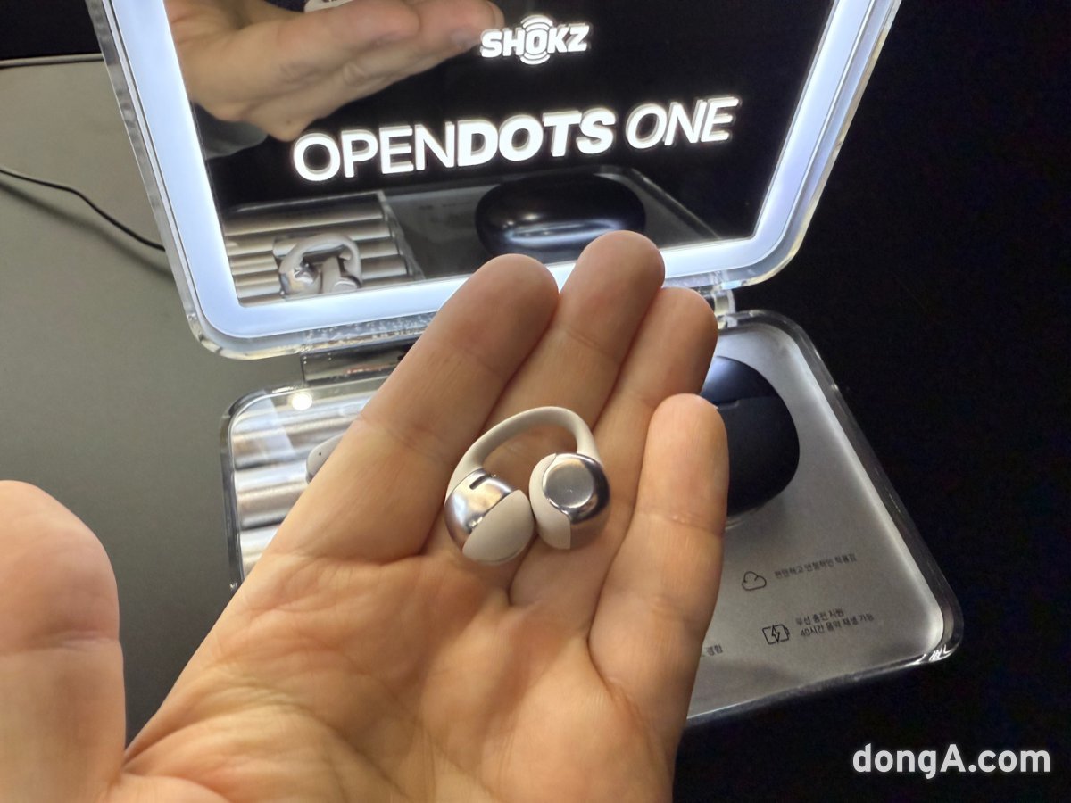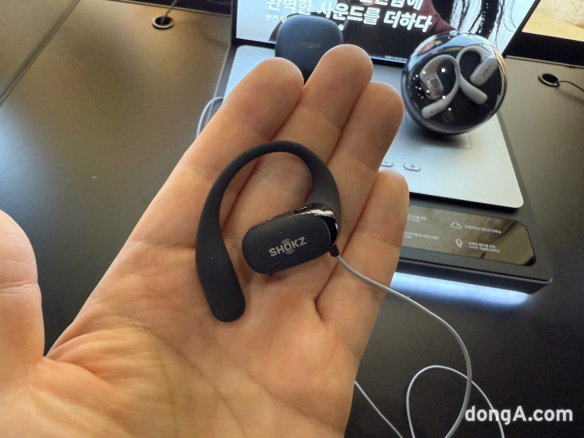 ‘오픈닷 원’은 샥즈 최초의 클립온 타입 이어폰으로, 한쪽당 6.5g의 가벼운 무게와 티타늄을 사용한 합금 프레임, 고급 실리콘 마감으로 착용감을 높인 것이 특징이다. 현장에서 직접 착용해 보니 귀에 끼웠을 때 불편함이 없으면서도 고정이 확실하게 돼 안정적인 느낌이 들었다. 달리기 등 격렬한 운동을 해도 귀에서 빠지지 않는다고 한다.