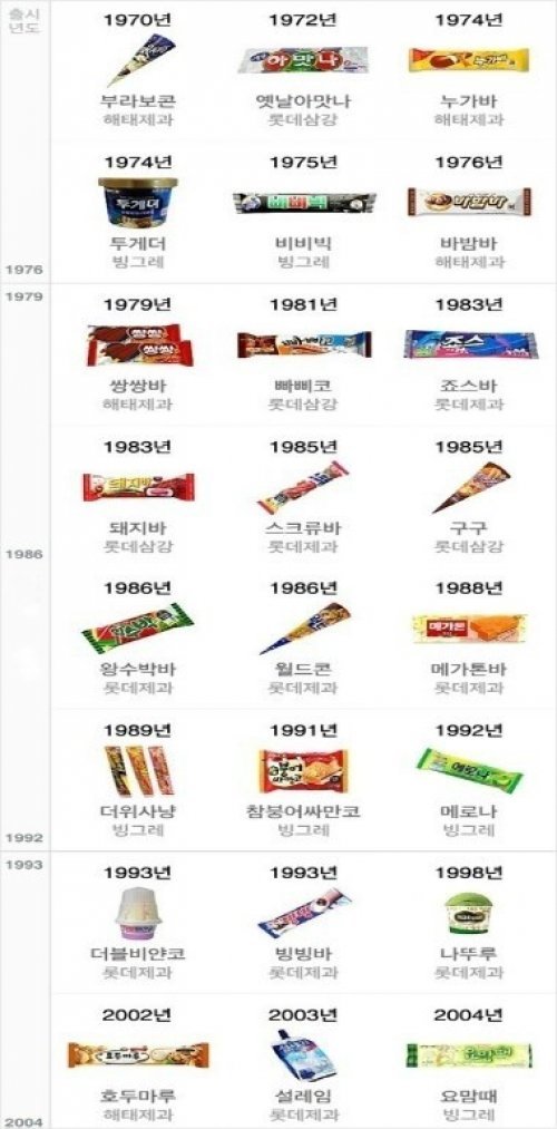 이 게시물에는 아이스크림의 종류별로 출시년도가 표시돼 있어 눈길을 끈다.