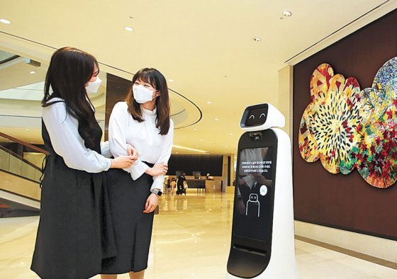 호텔 로비에서 활약하는 맞춤 컨시어지 서비스 안내로봇 ‘LG 클로이 가이드봇’. 롯데호텔 제공