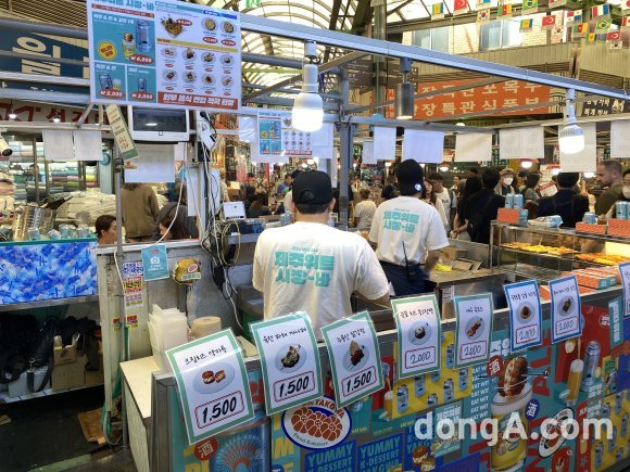 10일 오후 엔데믹(endemic·풍토병)을 맞이한 광장시장에는 평일 이른 오후 시간에도 사람들로 가득했다. 외국인 관광객과 MZ세대들이 마약김밥, 떡볶이, 빈대떡 등 다양한 길거리 음식을 맛보기 위해 곳곳에 자리를 잡고 있었다. 사진=윤우열 동아닷컴 기자 cloudancer@donga.com“광장시장은 전국을 통틀어서 전통음식을 먹기에 가장 좋은 곳이다. 사람들이 광장시장에 가는 이유는 ‘진짜’ 한국 음식이 있어서다.”