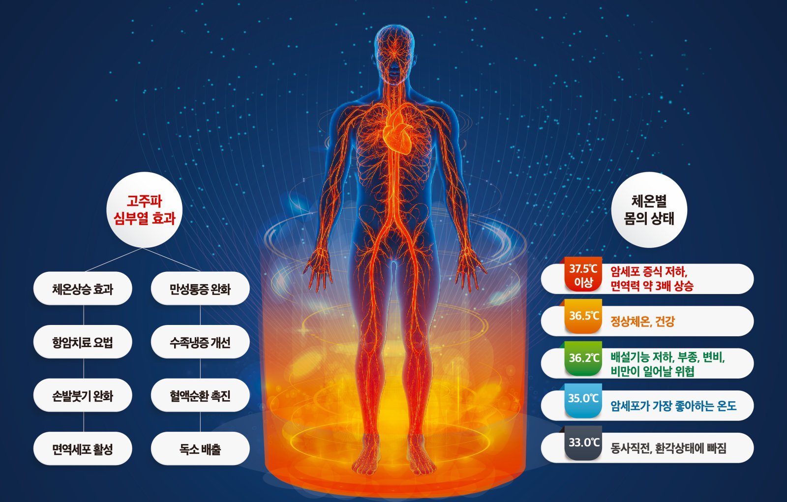 고주파 온열치료는 인체에 안전한 고주파 에너지를 이용해 근육층과 장기 주변의 체내 깊숙한 부위까지 42∼45도의 열을 전달한다. 심부열이 올라가면 막혀 있던 혈관이 풀리듯 열리면서 혈액이 빠르게 흐르기 시작한다. 그 결과 혈류량이 4∼5배 늘고 손발과 관절까지 혈액이 닿아 면역과 신체 기능이 함께 활성화된다. 이런 고주파 에너지를 활용한 온열치료는 실제 병원에서도 시행하고 있다. 허리가 삐끗하거나 디스크처럼 몸속 깊은 근육과 인대가 굳어 생기는 통증을 줄인다. 심부열이 혈관을 넓혀 수족 냉증이나 통풍 등 말초 혈액순환 장애로 생기는 시린 증상과 관절통을 줄여준다. 또 혈액순환이 개선되면서 만성피로와 불면증이 줄고 몸이 쉽게 풀려 컨디션 회복도 빨라진다.