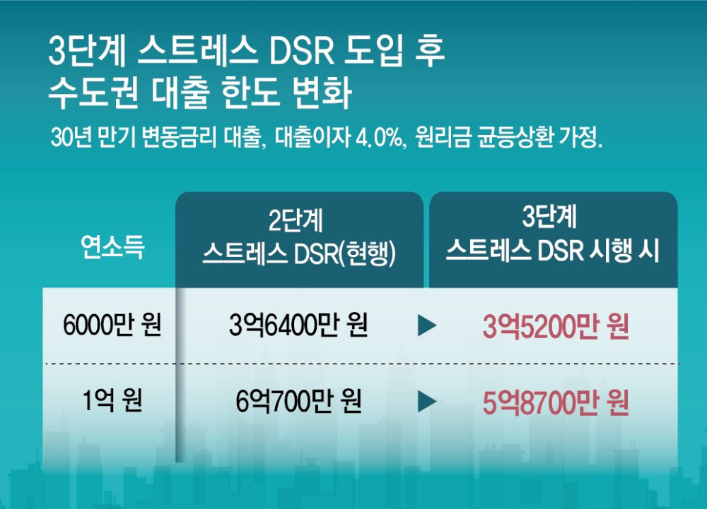 18일 금융당국의 시뮬레이션에 따르면 7월 3단계 스트레스 DSR 규제가 시행될 시 우리나라 가구당 평균소득(6000만 원) 수준인 차주는 금융권에서 30년 만기 변동금리(대출이자 4.0%·원리금 균등상환 가정)로 대출받을 경우 수도권 주담대 한도가 약 1200만 원 축소되는 것으로 나타났다. 현재 한도는 3억6400만 원이지만 7월부턴 3억5200만 원이 되는 것이다.