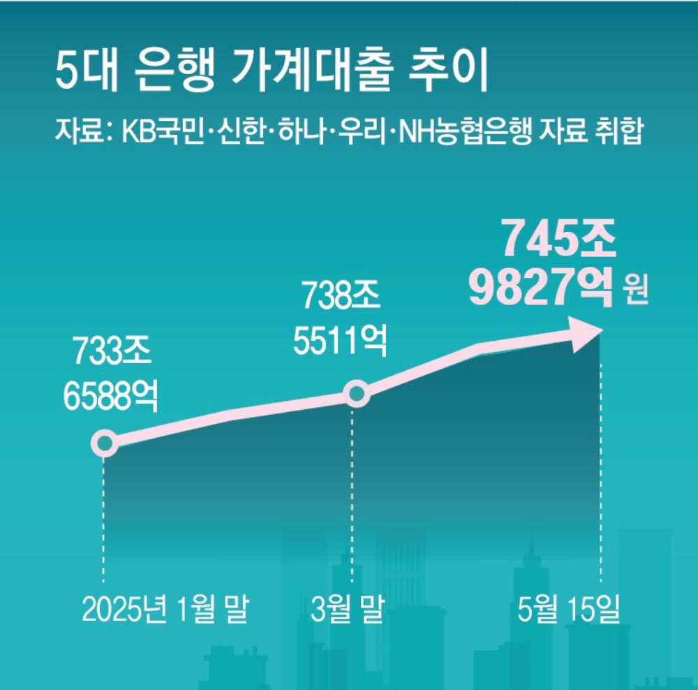 18일 금융권에 따르면 5대 은행(KB국민·신한·하나·우리·NH농협은행)의 15일 기준 가계대출 잔액은 745조9827억 원으로, 4월 말(743조848억 원)보다 2조8979억 원 불어났다. 증가 속도가 월말까지 그대로 유지된다면 이달 전체 증가액은 약 5조8000억 원에 이를 것으로 추산된다. 증가 폭이 지난달(+4조5337억 원)보다 1조3000억 원가량 뛰어 2024년 8월(+9조6259억 원) 이후 최대 규모가 될 가능성이 있다.