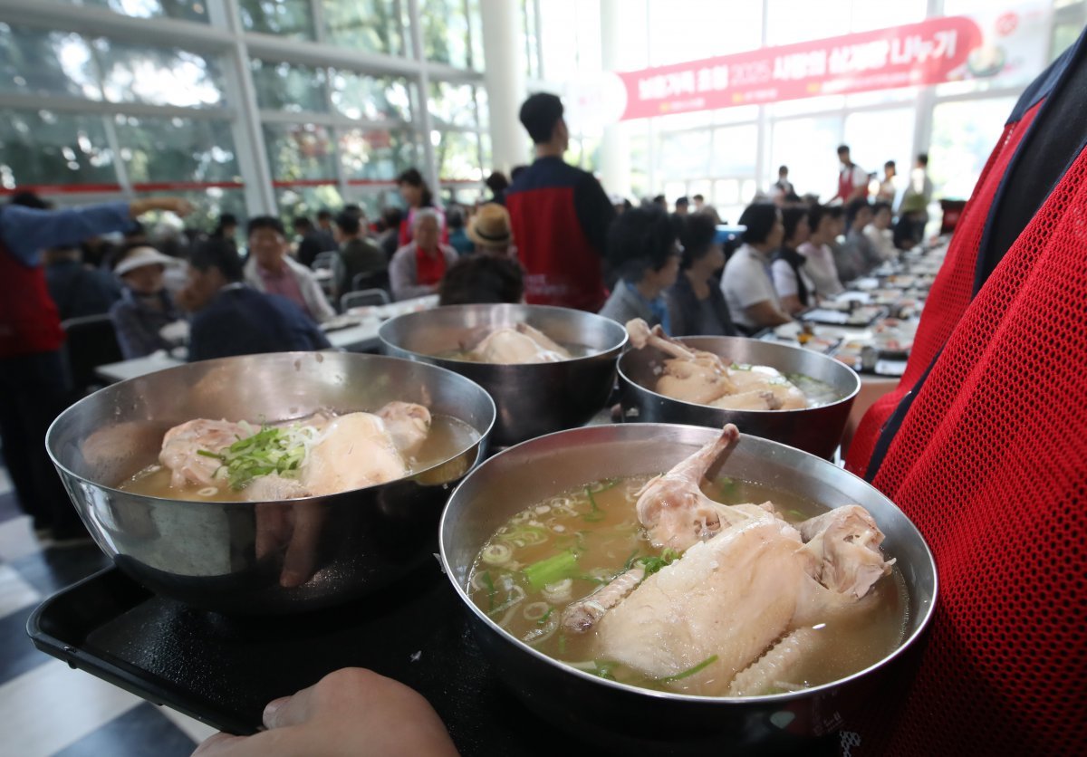 23일 부산 사상구 경남정보대학교 학생식당에서 열린 ‘사랑의 삼계탕 나누기 행사’에서 총학생회와 자원봉사자들이 제75주년 6·25 전쟁일을 앞두고 지역 보훈 가족 어르신 250여 명에게 삼계탕을 대접하고 있다. 2025.6.23/뉴스17월 20일 초복을 앞두고 생닭 수요가 증가하는 가운데 역대급 폭염이 이어지면서 더위에 약한 닭 수급에 비상이 걸렸다. 이에 따라 그동안 오름세였던 삼계탕 가격이 더욱 올라 외식 물가 부담이 커질 것으로 우려된다.