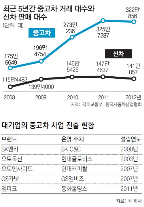 중고차 시장이 커지면서 대기업의 중고차 사업 진출이 잇따랐다. 현대자동차그룹의 물류계열사인 현대글로비스가 2003년 중고차 경매서비스를 시작했으며 현대캐피탈이 2007년 중고차 거래 사이트인 ‘오토인사이드’를 출범했다. GS칼텍스의 자회사인 GS엠비즈도 2007년 ‘GS카넷’을 출범했다. 2011년에는 동화홀딩스가 자회사 동화오토앤비즈를 통해 대형 오프라인 중고차 매장인 ‘엠파크’를 열었다.