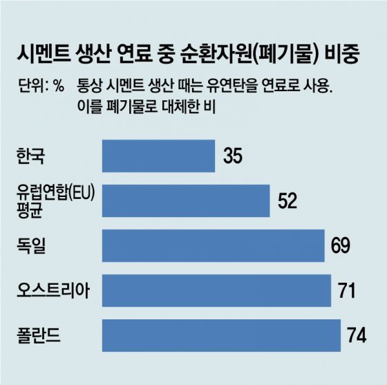 이처럼 탈탄소 흐름에 발빠르게 적응한 독일 시멘트 업계의 유연탄 대체율은 2020년 기준 69%에 이른다. 국내 시멘트 산업의 유연탄 대체율이 35%(2021년 기준)로 유럽연합(EU)의 평균(52%)에도 크게 못 미치는 것과 대조적이다. 국내 시멘트 업계 역시 향후 탄소세 부과 등에 대비해 대체율을 끌어올리기 위해 노력하고 있지만 소비자 거부감, 시멘트 수급 문제 등이 겹쳐 탈탄소 대응이 늦어지고 있다는 지적이 나온다.