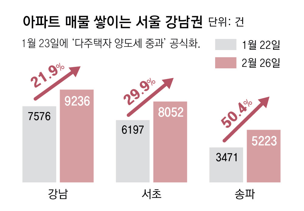 강남권 매물 증가세는 4월 초까지 이어질 것으로 전망된다. 다주택자가 양도세 중과를 피하려면 5월 9일까지 매매 계약을 체결해야 하는데, 토지거래 허가를 받아 계약을 마치는데 3, 4주가량이 걸릴 것으로 보인다. 남혁우 우리은행 부동산연구원은 “매수자들이 현재 호가 대비 최대 15% 낮은 매물을 원하는 것으로 보이지만 강남권 안에서도 가격 조정이 되지 않는 곳도 있다”며 “4월까지는 지켜봐야 할 것”이라고 했다.