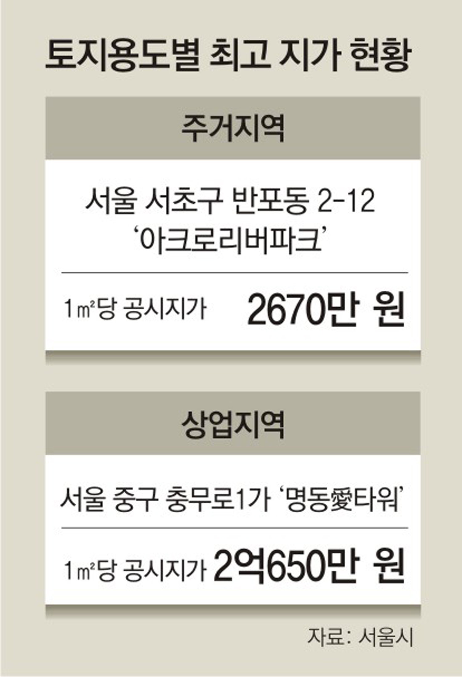전국에서 공시지가가 가장 높은 곳은 서울 중구 충무로1가 24-2(명동애타워)였다. 2004년부터 18년째 전국 땅값 1위를 지키고 있다. ‘네이처리퍼블릭 명동월드점’이 있는 이곳의 m²당 공시지가는 2억650만 원으로 지난해(1억9900만 원)보다 3.8%가량 올랐다. 주거지 중에는 서울 서초구 반포동 ‘아크로리버파크’가 지난해에 이어 올해도 가장 비싼 곳으로 나타났다. 이곳의 올해 m²당 공시지가는 2670만 원으로 지난해(2500만 원)보다 6.8% 상승했다.부동산업계는 개별공시지가에 불만을 품은 건물·토지주들의 이의 신청이 크게 늘어날 것으로 보고 있다. 양도세나 증여세, 상속세, 종합부동산세 등의 국세와 재산세, 취득세, 등록면허세 등의 지방세 부과 기준으로 활용되는 개별공시지가가 오르는 만큼 세금도 인상될 것이라는 우려 때문이다.