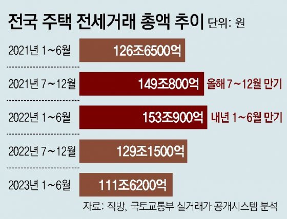 부동산 정보 플랫폼 직방이 19일 국토교통부 실거래가 공개시스템을 통해 분석한 결과에 따르면 올해 하반기(7~12월) 계약이 끝나는 전국 주택 전세 보증금 총액은 149조800억 원으로 집계됐다. 내년 상반기 만료 예정인 전세금 총액 153조900억 원을 더하면 향후 1년간 만기가 도래하는 전세금이 총 302조1700억 원에 이른다. 모든 전세 계약 기간은 2년인 것으로 추정했다.