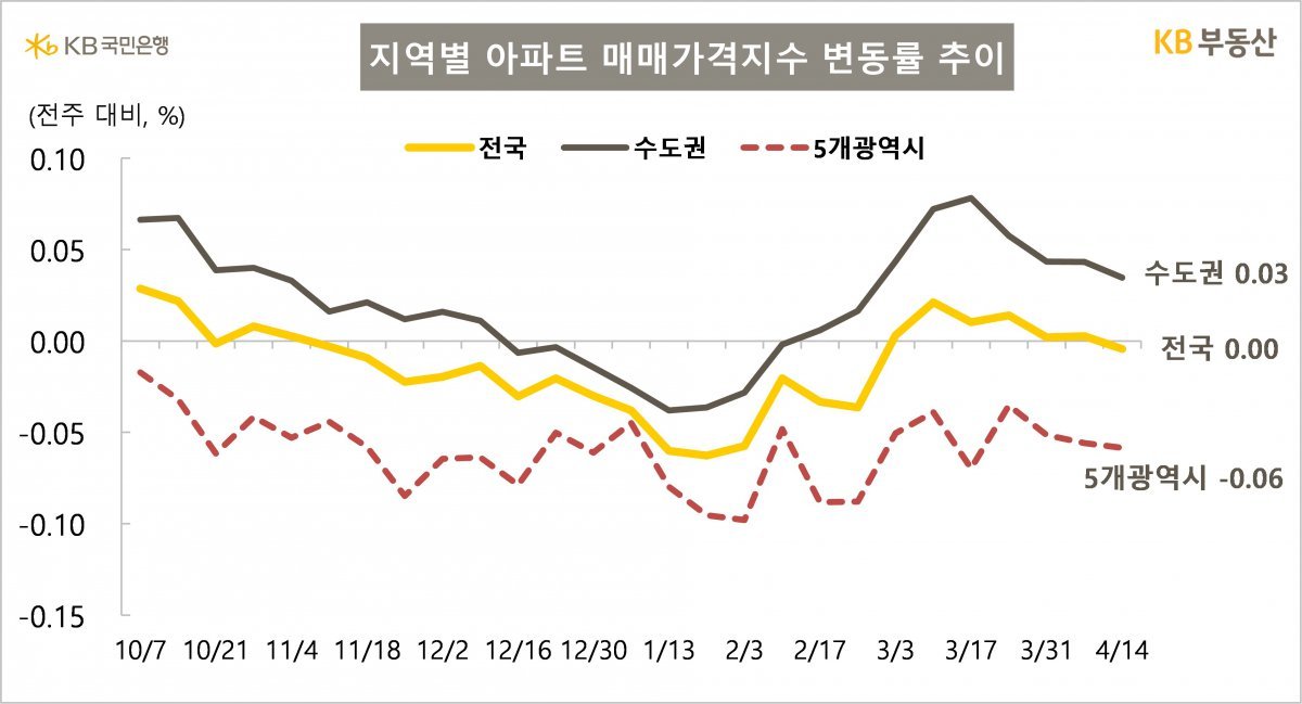 17일 KB부동산의 ‘주간 아파트 시장 동향’에 따르면 지난 14일 기준 전국 아파트 매매가격 변동률은 0.00%로 3주 연속 보합을 보였으며 수도권은 0.03% 올랐다.