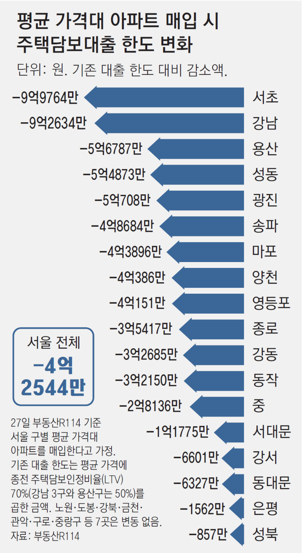 서울 25개 자치구의 평균 시세를 고려할 때 이번 규제로 대출 한도가 줄어드는 자치구는 18곳이며 해당 지역에는 총 127만6257채의 아파트가 있다. 서울 전체 아파트(171만7384채)의 74.3%가 대출 규제 영향권에 놓이는 셈이다.
