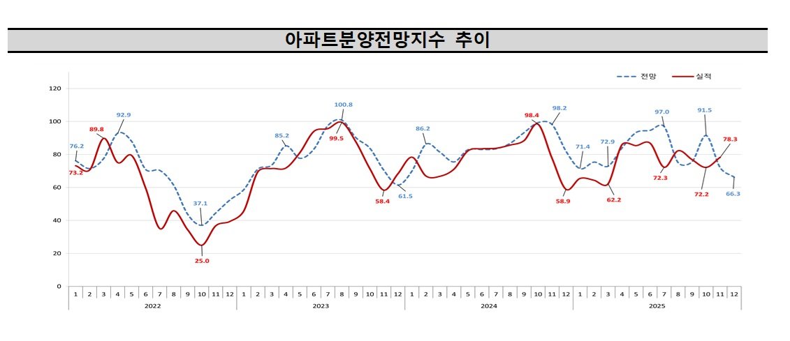 9일 주택산업연구원(주산연)이 주택사업자를 대상으로 설문 조사한 결과, 12월 아파트 분양전망지수는 전월 대비 5.8포인트(p) 하락한 66.3으로 나타났다. 이는 2023년 12월 이후 최저치다. 수도권은 6.2p(73.3→67.1) 하락 전망됐고, 비수도권은 5.8p(71.9→66.1) 하락했다.