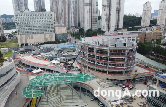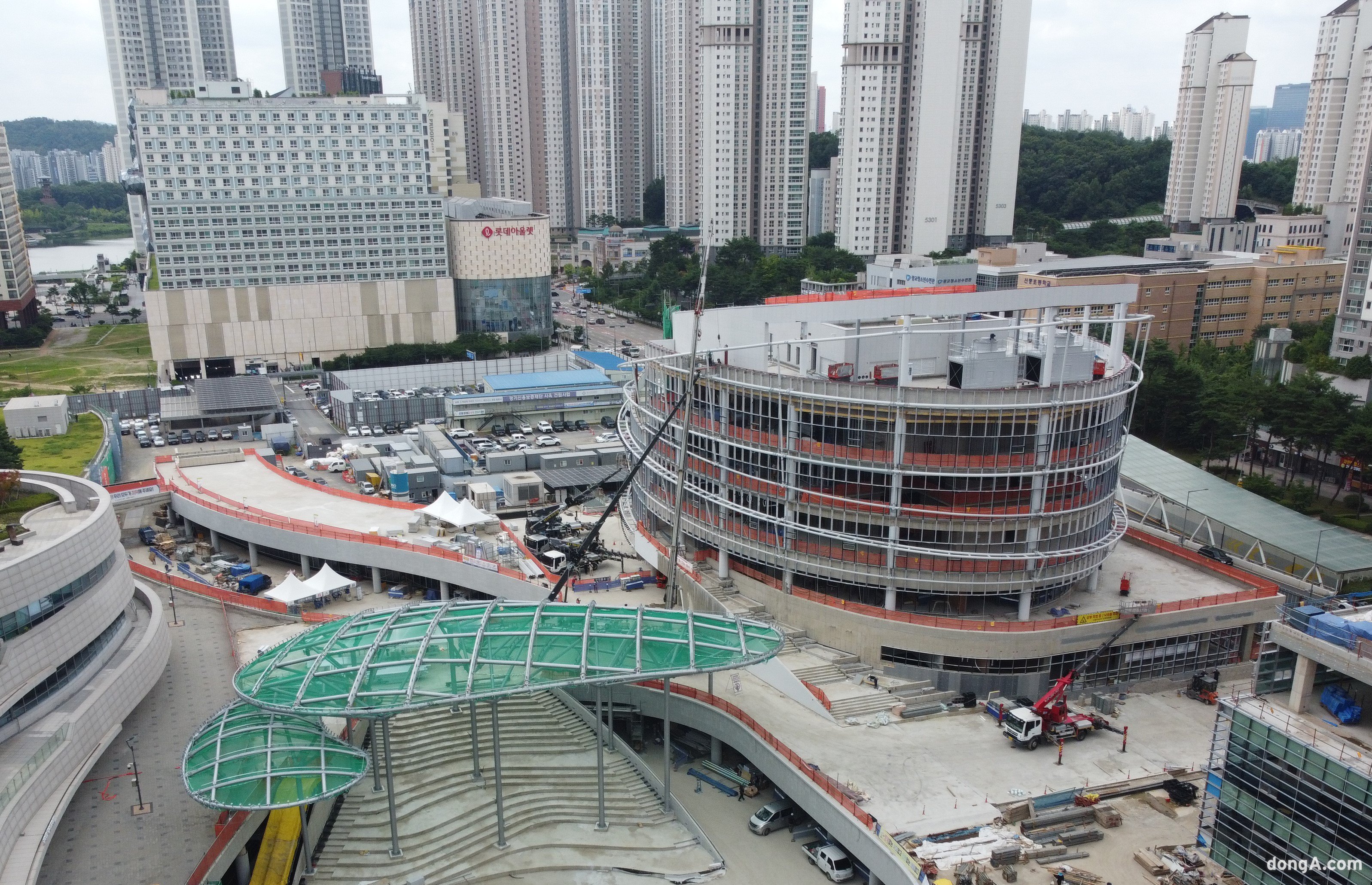 대보건설 경기도서관 및 광장·보행몰 건립공사가 골조공사를 마치고 비정형 외관을 드러냈다.