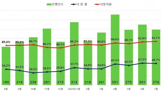 서울 아파트 낙찰률은 46.7%로 전월(47.2%) 대비 0.5%p 낮아졌다. 낙찰가율은 전달(92.9%)에 비해 0.8%p 상승한 93.7%로 2022년 8월(93.7%) 이후 1년 11개월 만에 최고치를 기록했다.