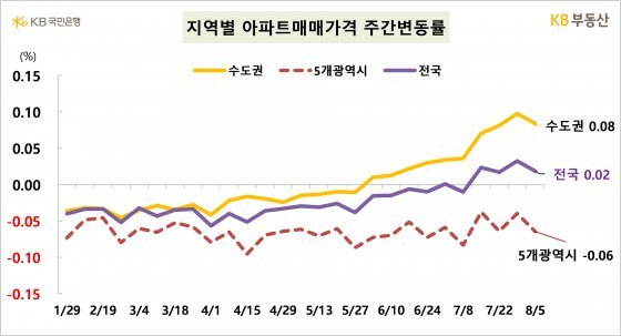 8일 KB부동산의 ‘주간 아파트 시장동향’ 자료에 따르면 지난 5일 기준 전국 아파트 매매가격은 1주 전보다 0.02%, 수도권은 0.08% 올랐다.