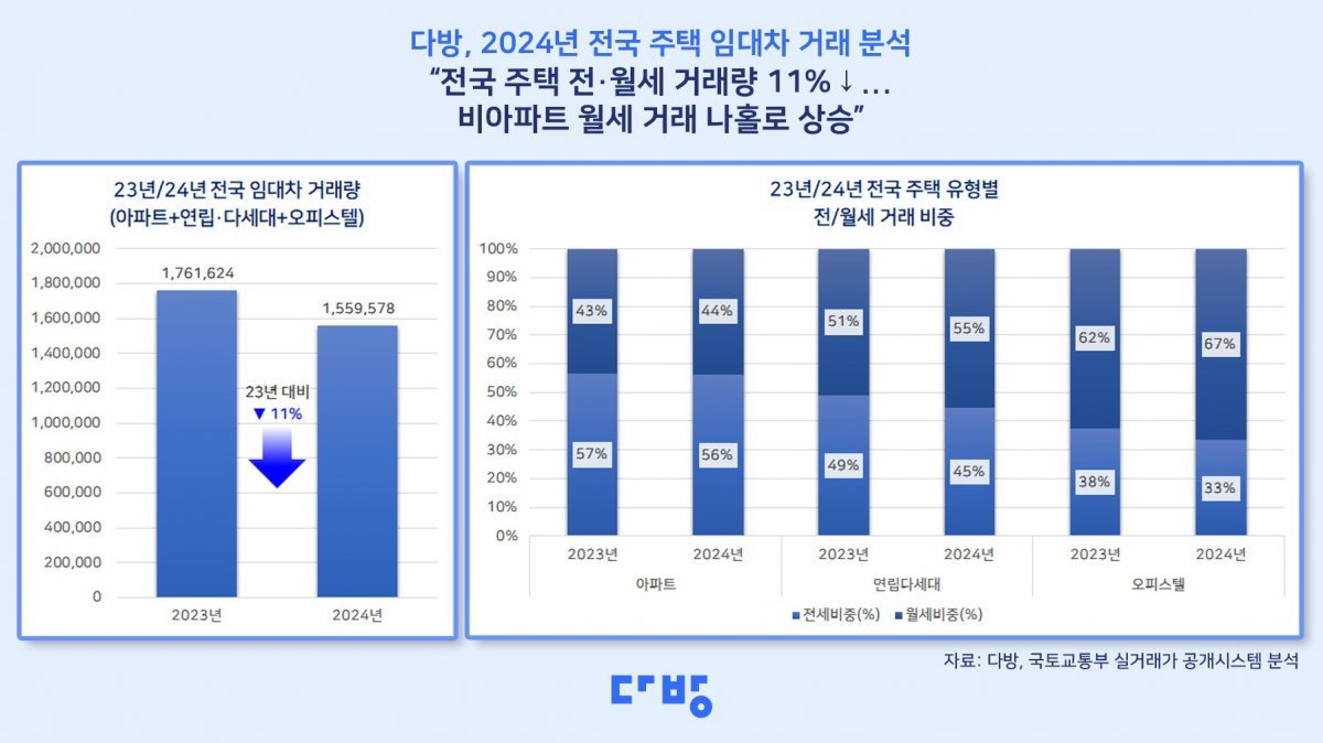 9일 부동산 정보 플랫폼 다방이 국토교통부 실거래가를 바탕으로 2024년 한 해 동안 거래된 전국 주택 유형별 임대차 거래를 분석한 결과, 지난해 전국 주택 전월세 거래량은 2023년(176만1624건)에 비해 11% 하락한 155만9578건으로 집계됐다.