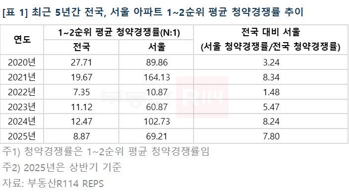 서울은 69.21대 1로 전국 경쟁률의 7.8배에 달했다. 최근 5년간 서울과 전국 청약경쟁률 격차는 2021년 8.34배까지 치솟은 뒤 2022년 1.48배로 감소했으나, 2023년 5.47매, 2024년 8.24배, 2025년 7.8배로 다시 커졌다.