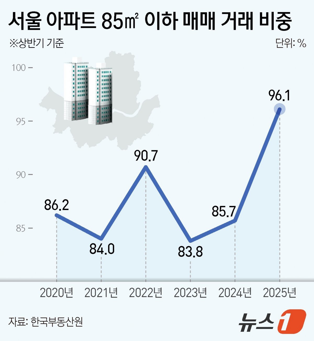 올해 상반기 서울에서 매매된 아파트 10가구 중 9.6가구는 전용면적 85㎡(25.7평) 이하인 것으로 나타났다. 이는 비교 가능한 통계가 집계된 2006년 이후 가장 높은 비중이다.