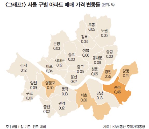 7월 이후에도 최고가 행진을 이어가는 서울 송파구 잠실동 리센츠. 동아DB 수도권 및 규제지역 주택담보대출 한도를 최대 6억 원으로 제한하는 ‘6·27 대출 규제’가 시행되면서 주택시장이 다시 안정을 찾을 것이라는 기대가 높았다. 하지만 최근 발표된 KB부동산의 ‘주간 아파트 통계’ 자료는 예상과 다른 모습을 보이고 있다(그래프1 참조). 8월 11일 기준 서울 아파트 가격이 평균 0.13% 상승한 것으로 나타났기 때문이다. 특히 송파구(0.46%)와 광진구(0.35%), 영등포구(0.30%) 아파트 가격은 전주 대비 0.3% 이상 급등하는 모습을 보였다. 시중 유동성을 조였음에도 아파트 가격이 상승하는 원인은 무엇일까.