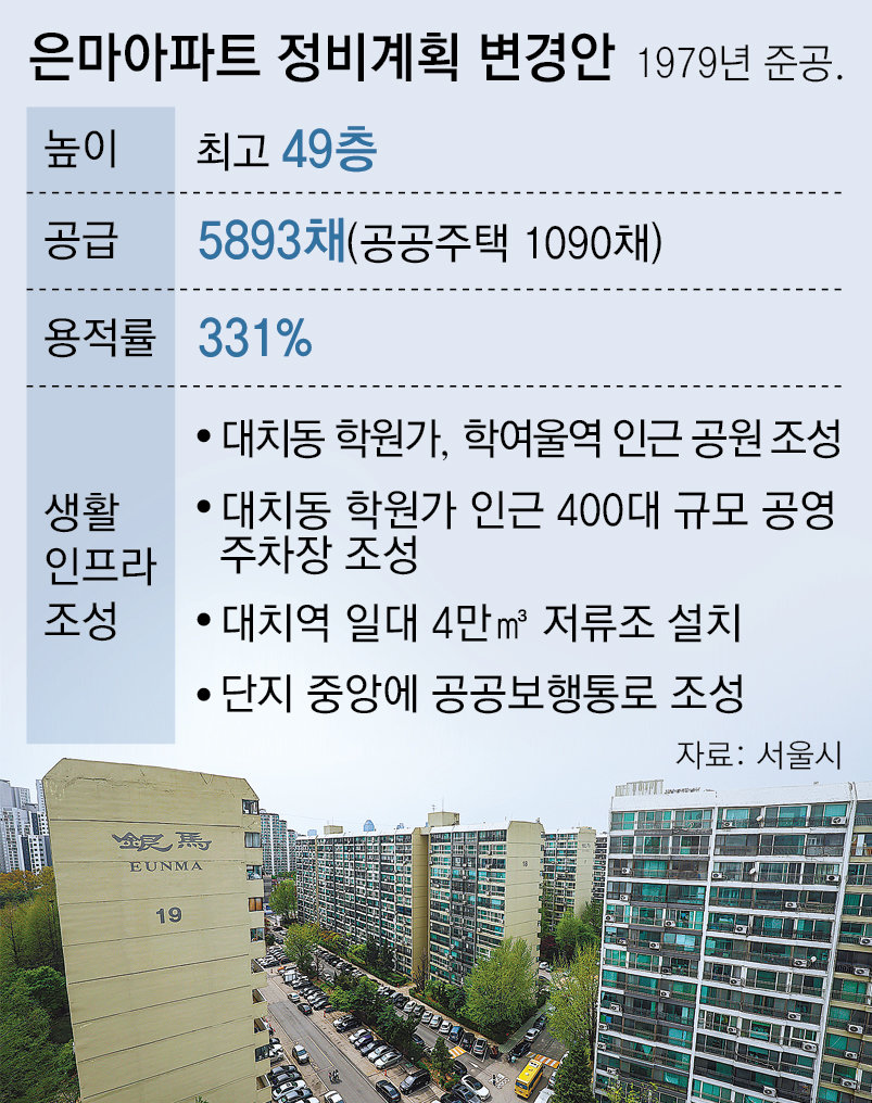 특히 향후 사업 추진 과정에서 ‘지나친 고밀화’를 우려하는 목소리가 계속될 가능성이 있다. 서울시에 따르면 은마아파트는 지난해 3월 서울시 조례 개정으로 도입된 역세권 용적률 완화 규정을 적용받아 용적률 331.51%로 지어진다. 개정 조례를 적용받은 첫 사례다. 은마아파트의 정비면적 54%가 지하철 승강장 250m 범위 내라는 점에 근거했다. 은마 이전까지 서울의 재건축 단지는 사실상 용적률 300%가 상한선이었다.