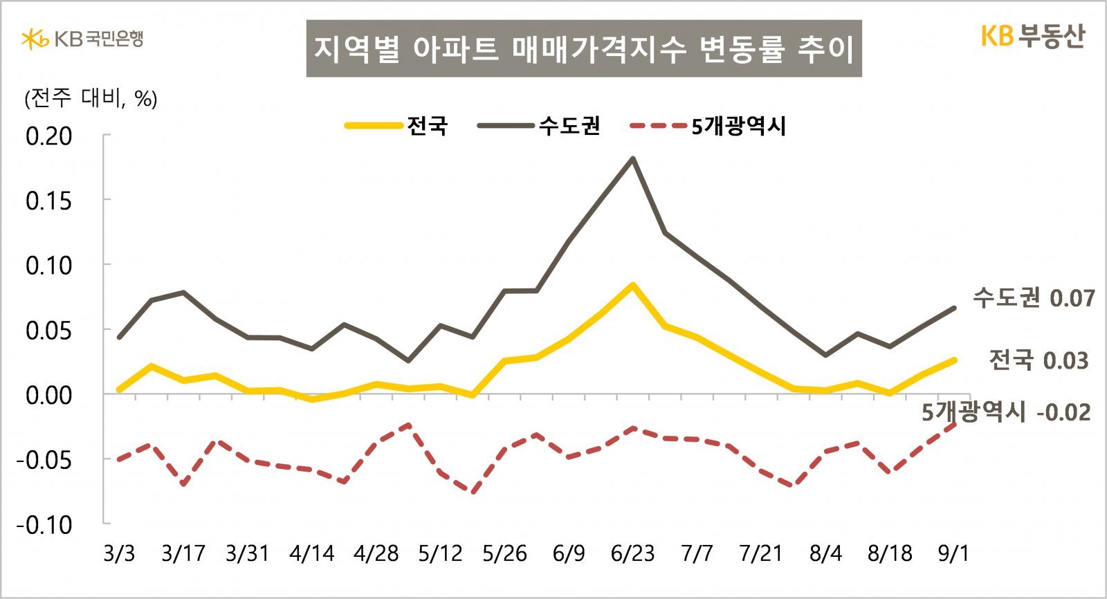 4일 KB부동산이 발표한 9월 첫 주 KB아파트시장동향에 따르면 지난 1일 기준 전국 아파트 매매가격이 1주 전보다 0.03%, 수도권은 0.07% 상승했다.