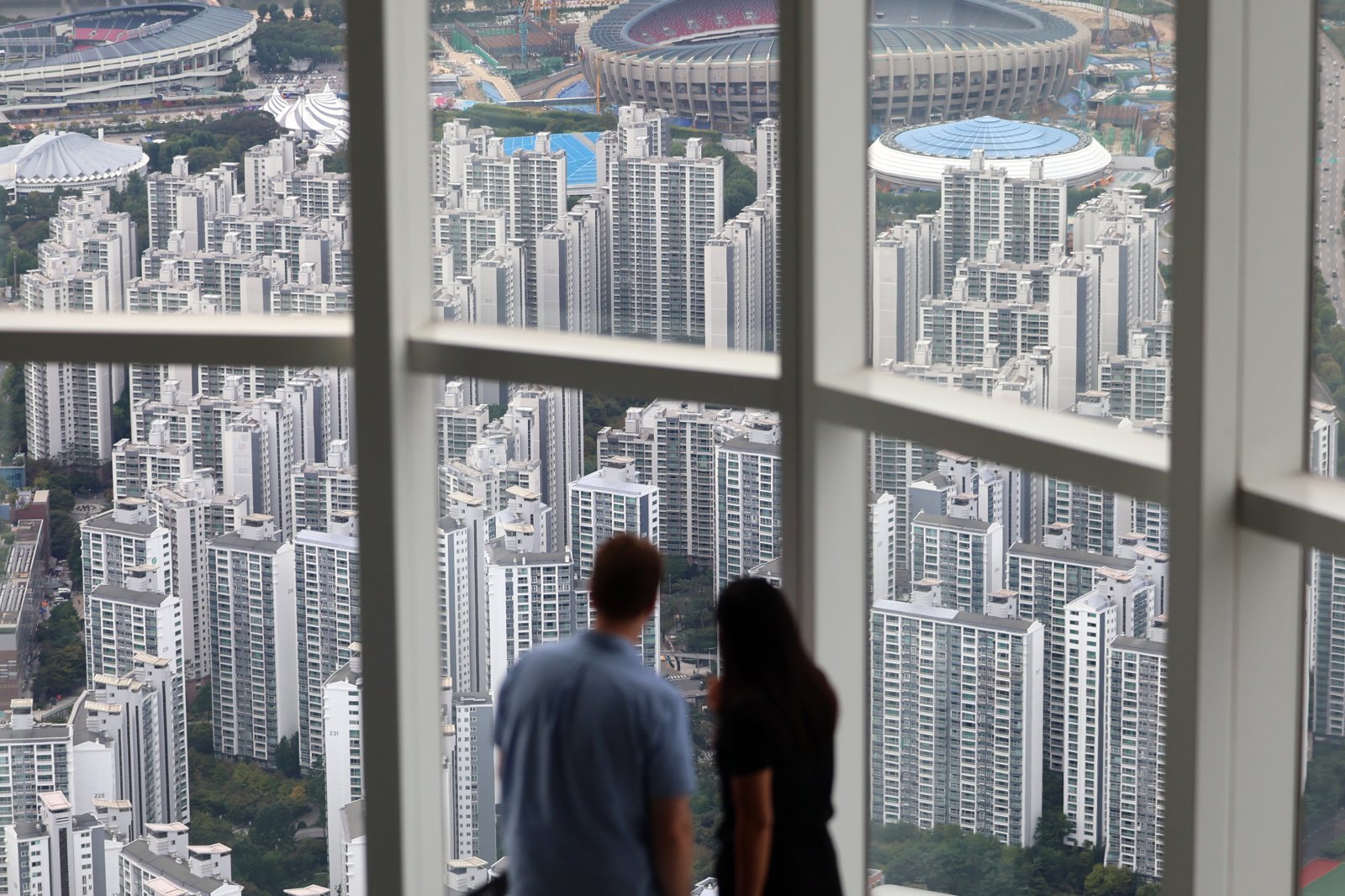 정부가 15일 부동산 관계장관회의를 열고 ‘주택시장 안정화 대책’을 확정·발표했다. 서울 송파구 롯데월드타워에서 바라본 아파트 단지. 2025.10.15. 뉴스1―연소득 1억 원이다. 서울 강북의 12억 원짜리 아파트를 매수하려면 대출이 얼마나 가능한가.