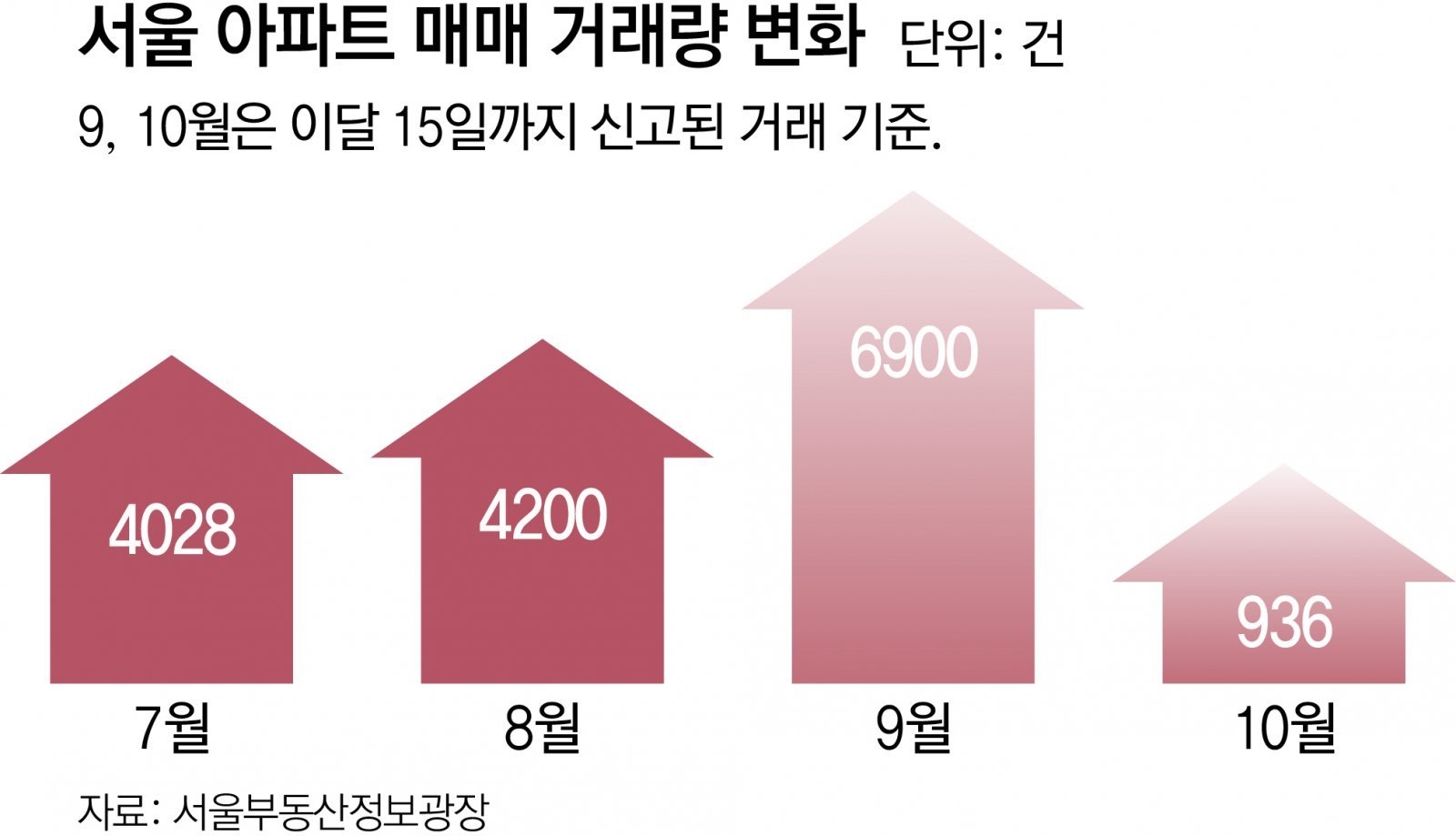 이날 서울부동산정보광장에 따르면 10월 들어 서울에서만 아파트 매매 거래 936건이 신고됐다. 추석 연휴가 길었다는 점을 감안하면 매우 짧은 기간 동안 거래가 집중된 것이다. 9월 거래량 역시 6900건으로 8월(4200건)보다 늘었다. 아직 9, 10월 거래 신고 기한이 지나지 않았다는 점을 감안하면 거래량은 더 늘어날 것으로 보인다.