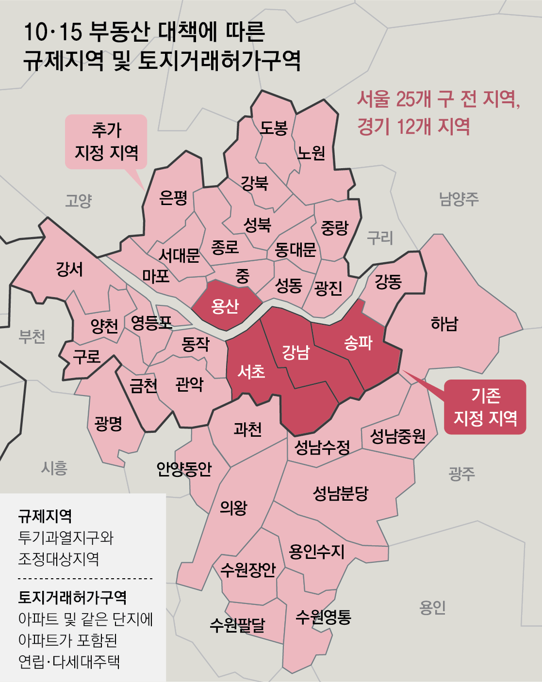 15일 정부는 ‘주택시장 안정화 대책’을 발표하고 서울 25개 구와 경기 과천시, 광명시, 성남시 분당·수정·중원구, 수원시 영통·장안·팔달구, 안양시 동안구, 용인시 수지구, 의왕시, 하남시를 16일부터 규제지역으로 지정했다. 또 20일부터는 해당 지역의 아파트와 아파트가 단지 내에 포함된 연립·다세대주택 전체를 토지거래허가구역으로 지정하기로 했다. 이번 조치로 서울 전체 약 156만8000가구, 경기 지역 약 74만2000가구 등 총 230만여 가구가 규제 대상이 됐다. 과거 문재인 정부에서 수도권 전역과 일부 광역시 등을 규제지역으로 지정한 적은 있었지만, 토지거래허가구역을 서울 전역과 경기 남부 지역에 걸쳐 광범위하게 지정한 것은 처음이다.