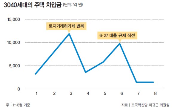 3040세대의 자금 조달에서 차입금 의존도가 높아지자 이재명 대통령은 “빚내서 집 사는 시대를 끝내겠다”며 “영끌과 갭투자 수요를 원천 차단하겠다”는 입장을 꾸준히 밝혀왔다. 6·27 규제에서는 주택담보대출 한도를 6억 원으로 제한하고, 9·7 대책에서는 규제지역 주택담보인정비율(LTV)을 50%에서 40%로 낮추는 규제를 시행했다. 이후 차입금 규모는 감소 추세를 보였다(그래프 참조).