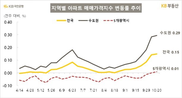 23일 KB부동산 10월 셋째 주 주간 아파트 시장 동향(20일 기준)에 따르면 전국 아파트 가격 변동률은 1주 전보다 0.15% 오르며 8주 연속 상승했다.