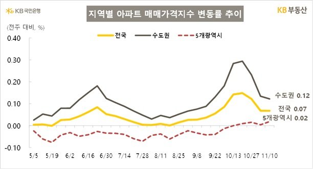 13일 KB부동산 11월 둘째 주 주간 아파트 시장 동향(10일 기준)에 따르면 전국 아파트 가격 변동률은 전주 대비 0.07% 오르며 11주 연속 상승했다.