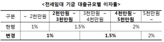 지금까지 기금 대출액 기준 △2000만 원 이하(연 1%) △4000만 원 이하(연 1.5%) △4000만 원 초과(연 2%)의 임대료를 납부해야 했다. 하지만 오는 10월부터 3000만 원까지 연이율 1%, 5000만 원까지 연 1.5%의 이자율이 적용된다.