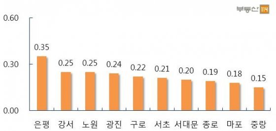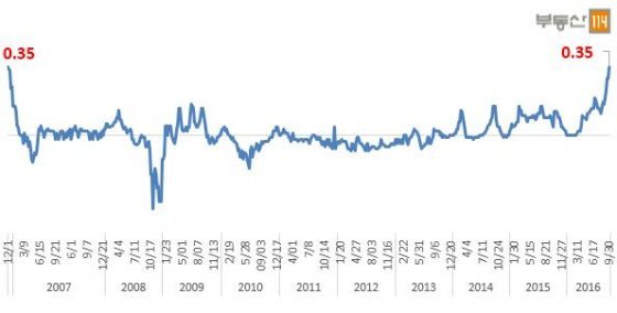 서울 매매 주간 가격변동 추이(자료제공:부동산114)30일 부동산114에 따르면 이달 마지막 주 서울 매매가 상승률은 0.35%로 지난 2006년 12월 이후 10년 만에 최고치를 기록했다.