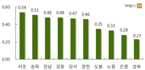 서울 주요지역 주간 매매가격 변동률(자료제공:부동산114)자치구별로는 △서초(0.54%) △송파(0.51%) △강남(0.48%) △강동(0.48%) △강서(0.47%) △양천(0.46%) △도봉(0.35%) △노원(0.33%) 순으로 매매가가 상승했다. 서초는 신규분양(반포동 아크로리버뷰, 잠원동 래미안신반포리오센트)에 대한 기대감이 높아지면서 일대 재건축 아파트 값이 연일 강세다. 송파는 출시됐던 매물이 한두 건 비싸게 팔리면서 매매가가 껑충 뛰었고, 강남은 대치동 은마아파트가 재건축 설계안을 확정하면서 매도자들의 기대감이 높다. 강동은 관리처분계획이 조합원 임시총회를 통과하며 재건축사업이 한층 속도를 내고 있고, 강서는 지하철5호선 주변 역세권 아파트로 실입주 수요뿐 아니라 투자수요까지 더해졌다.